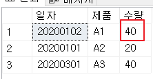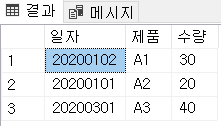 123456789101112CREATE TABLE T매출 (일자 NVARCHAR(08),제품 NVARCHAR(30)PRIMARY KEY,수량 NUMERIC(18,0) DEFAULT 0 NULL)INSERT INTO T매출 (일자, 제품, 수량)VALUES ('20200101', 'A2', 20),('20200102', 'A1', 30),('20200301', 'A3', 40)SELECT *